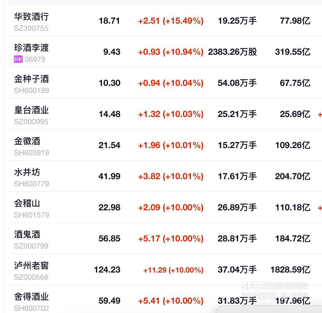 1月29日午间启动,白酒板块握续拉升,白酒股集体大涨。竣事29日14点10分,泸州老窖、珍酒李渡、金种子酒、皇台酒业、金徽酒、水井坊、酒鬼酒、舍得酒业纷繁涨停,山西汾酒、古井贡酒、迎驾贡酒涨幅超9%,贵州茅台、五粮液、今世缘、口子窖涨超8%,洋河股份涨幅超7%。涨幅最高的是酒类连锁股华致酒行,29日下昼两点多涨幅一度逾越16%。