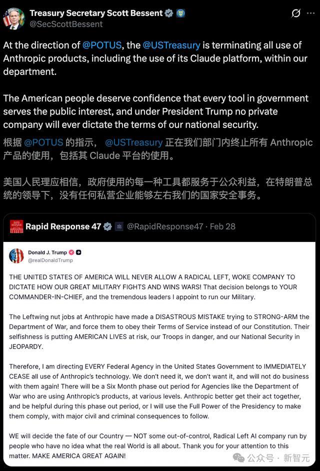 一早,财政部长Scott Bessent老成官宣:全面关停Anthropic旗下通盘的AI器具。