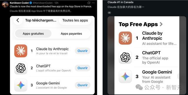 另一家Appfigures数据表现,Claude日下载量已初度杰出ChatGPT,并在各人六个国度APP Store领跑榜单。