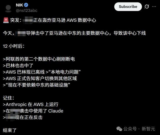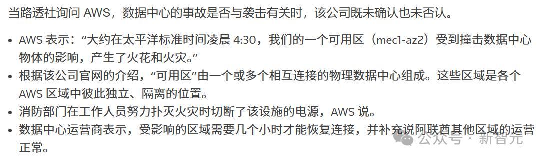 就在Claude运行大面积报错的40多分钟后(北京时候20:30控制),亚马逊AWS位于阿联酋的一处中枢数据中心,倏地被「不解物体」击中!